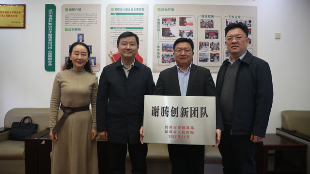 谢栋梁部长和李明书记共同为汉川市“医心如镜”统战实践创新基地揭牌,同时授予市人民医院神经外科学科带头人谢腾创新团队牌匾。