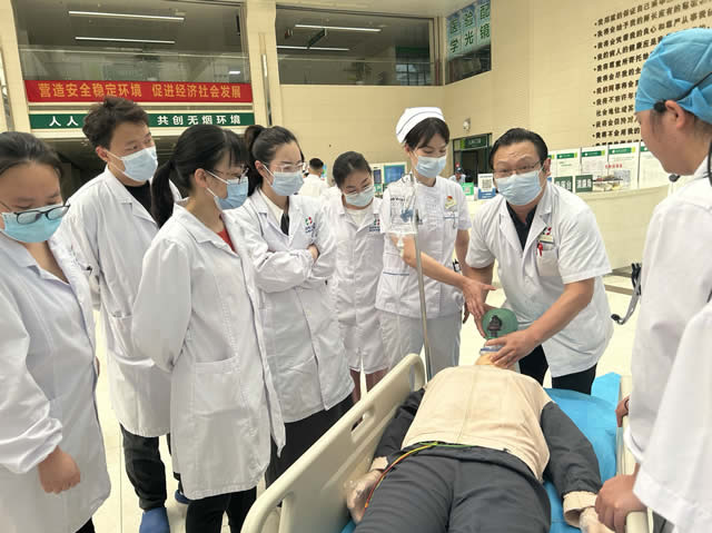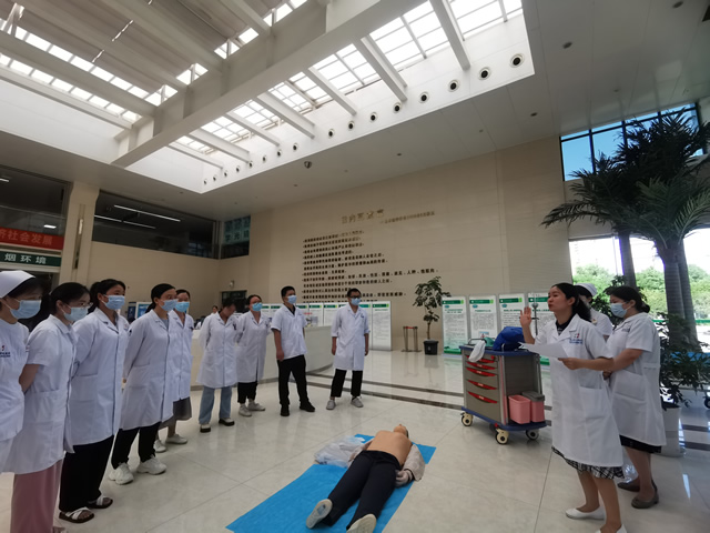 门诊科室、医学检验科、超声影像科、CT室、病理科等门诊、医技科室医护人员,以科室为单位分别组队开展练习。演练结束后,急诊科护士长罗文、门诊办护士长李萍芳分别对各组演练情况做了点评并示范操作,急诊科主任邹行斌对整个演练操作环节做了总结性点评。