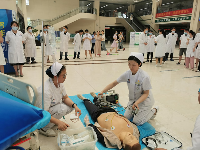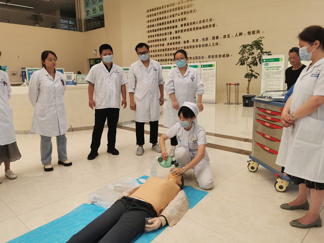 当天下午4点,演练正式拉开序幕。模拟场景为:门诊一楼大厅客服咨询台处,一位患者突发倒地、意识丧失。客服咨询台护士发现后,立即判断生命体征,并大声呼救,同时另一名护士立即电话通知急诊科、门诊办前来支援,初步判断患者无自主呼吸及心跳,立即对其实施徒手心肺复苏。急诊科接到电话后,值班医生与护士立即携带抢救设施前来施救。在急诊科医生主持下,一系列急救操作有序进行,最终患者“心肺复苏成功”,转至急诊科进一步治疗。