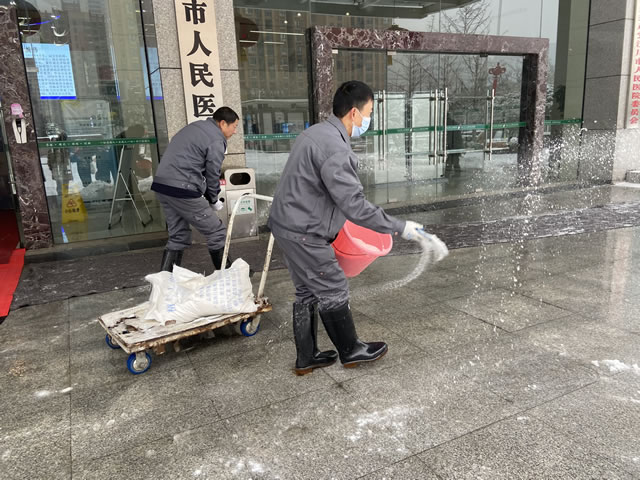 后勤应急小组积极行动,及时调用应急物资、设备和人员。2月3日凌晨起,医院组织干部职工及时清理主干道路、主要路口、台阶等道路积雪,铲除路面冰冻,将提前储备的2吨工业用盐铺撒在重点区域部位。医院还在斜坡、台阶和门急诊大厅出入口等易滑路段铺设防滑垫,防止患者滑倒,保证医护人员和患者安全出行。