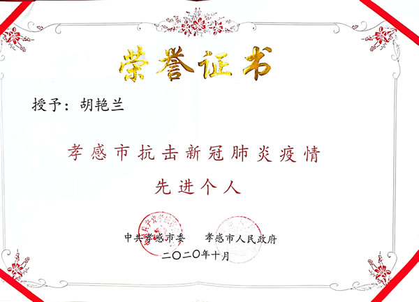 “孝感市抗击新冠肺炎疫情先进个人” 胡艳兰