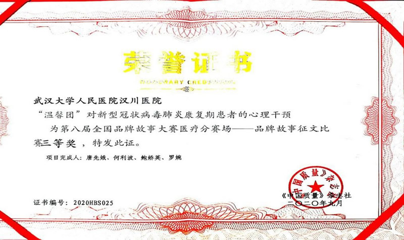 汉川市人民医院积极响应,护理部高度重视此次比赛,广泛宣传、发动抗击新冠肺炎的一线医务人员积极参与撰写,在全国众多的征文比拼中,由汉川市人民医院唐先娥、何利波、鲍姣英、罗婉撰写的《“温馨团”对新冠肺炎康复期患者的心理干预》率先入围,赢得了评委、参赛选手及在场观众的一致认可,最终荣获第八届全国品牌故事征文比赛三等奖。