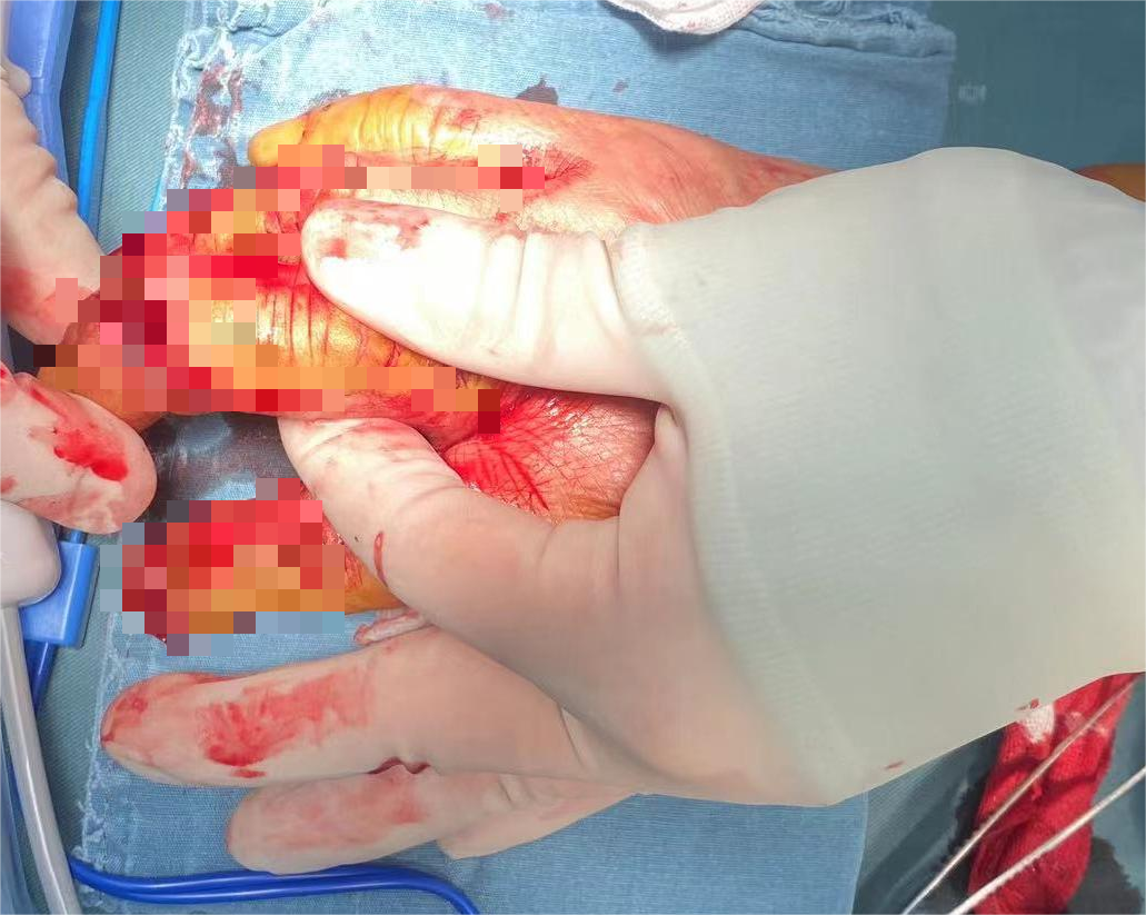 几日前,周大爷工作时不慎将右手卷入机器,致右手中指中节中远段环形撕裂不全离断,仅剩少量软组织连续及屈指肌腱连续,伸指肌腱及中节指骨完全断裂,指体固有神经血管束断裂,创口内大量异物残留,示指指腹皮肤逆行撕脱,环指指端撕裂累及甲床损伤及指骨粗隆部骨折。