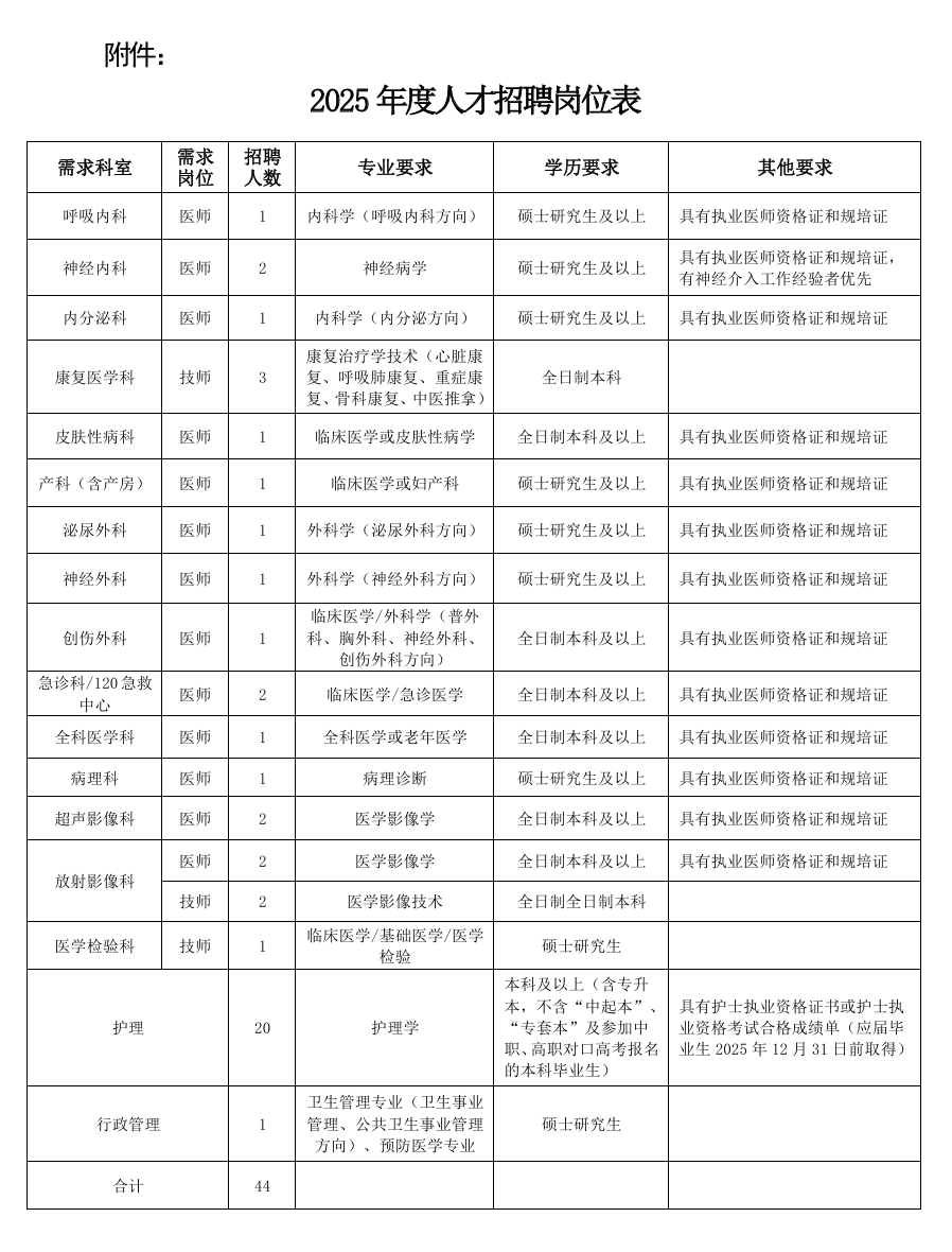 专业、学历、执业资质及规培等资格条件,见《岗位表》。其中,学历要求为学位、学历双证齐全;学历毕业时间以毕业证填写的时间为准,一般应在2025年7月31日之前毕业;2025年8月1日以后毕业的人员,一般不作为2025届毕业生报考(博士研究生除外)。