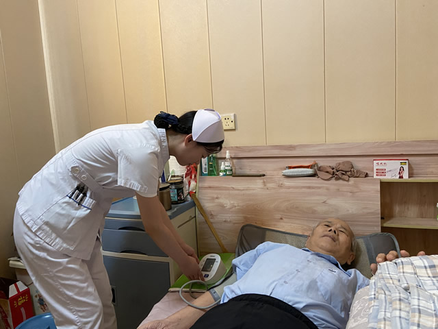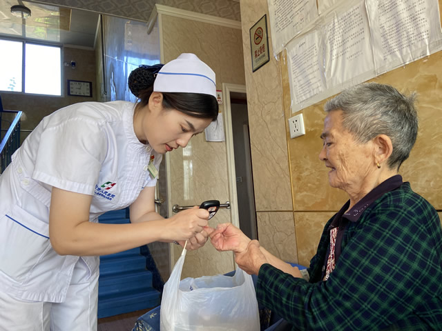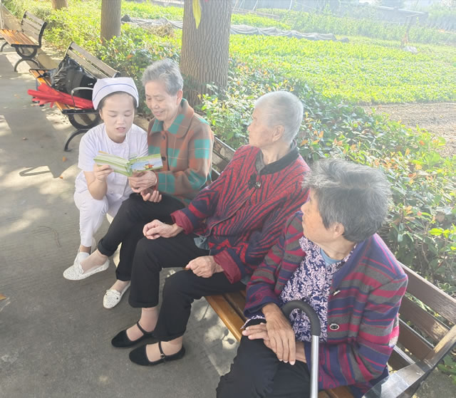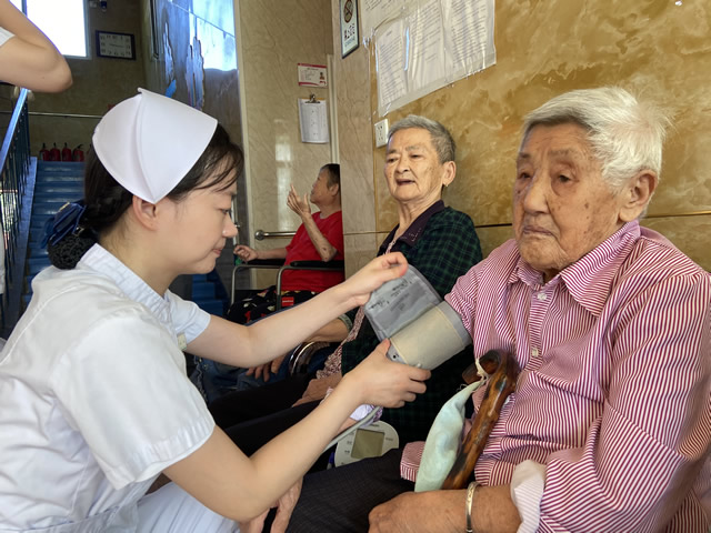 义诊现场,医护人员细心地为老人们测量血压、血糖,详细地解答大家关于高血压、高血糖等老年常见疾病问题,耐心地指导护工在日常工作中注意老人们的饮食及用药等健康知识,现场还发放了健康宣教手册。