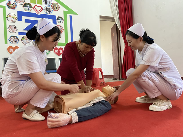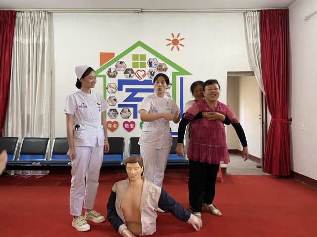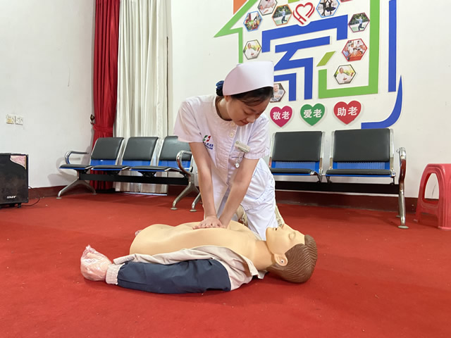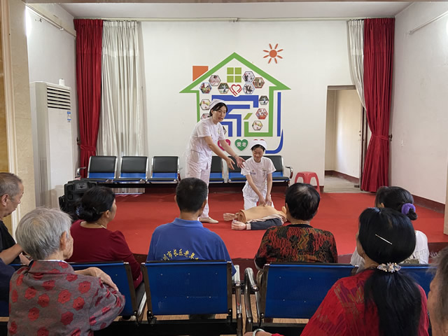 急诊科护士长罗文、护士张俊为养老院工作人员讲解并演示了心肺复苏、海姆立克急救法等急救技能,工作人员争先恐后上台参加演练。全科医学科护士长胡玲围绕老年人跌倒、噎呛、烫伤、走失等四个方面的急救知识进行了详细讲解,在场老人及工作人员聚精会神,积极与医护人员互动,现场学习氛围十分浓厚。